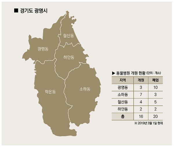 광명시는 1991년 처음 동물병원이 개원한 이례 2019년 3월 1일 현재까지 66%에 달하는 20개소 동물병원이 폐업하고, 16개의 동물병원이 개원해 있다. 개원한 동물병원의 절반 이상이 폐업을 신청했을 정도로 개원에 어려움을 겪는 지역이다.