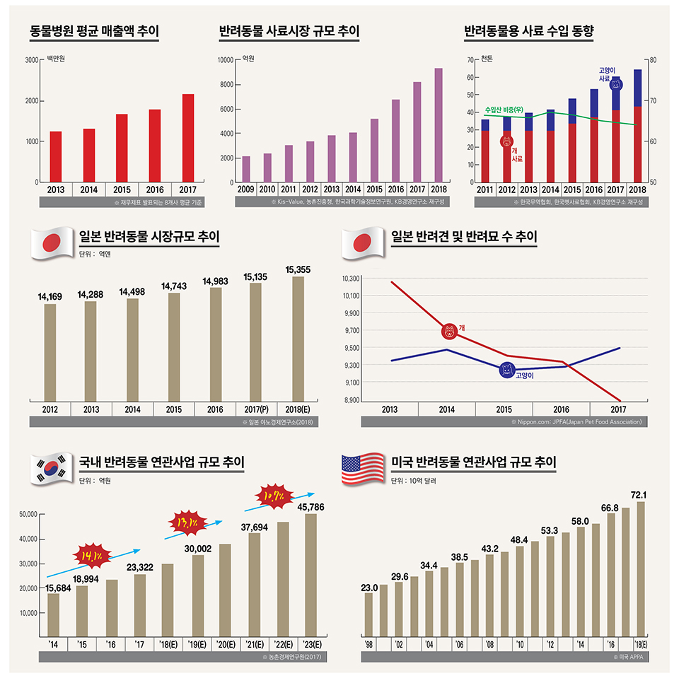 한편 미국 반려동물 시장은 2017년 695억 달러, 2018년말 721억 달러로 연평균 성장률 6.6%로 꾸준한 성장세를 이어오고 있으며, 업종별로는 사료와 간식 41.8%, 수의사 진료 24.6%, 용품과 의약품 21.7% 분포를 보이고 있다. 일본의 2017년 반려동물 시장 규모는 전년대비 1% 성장한 1조5,135억 엔으로 동물사료(4,700억엔), 동물용품(2,500억엔), 동물서비스(의료포함 7,500억엔) 분포로 나타났다. <편집자주>