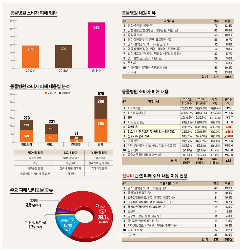 동물병원 소비자 피해 내용으로는 1위가 ‘치료부작용’이 2018년 74건(25.5%), ‘진료비 과다청구’가 41건(14.1%), ‘오진’ 28건(9.7%) 순으로 전년대비 건수와 비율 모두 줄어든 것으로 나타났다. 반면 ‘과잉진료’ 32건(11.0%)으로 전년대비 39.1%, ‘진료비 사전 미고지 및 동의 없는 임의진료’ 30건(10.3%)으로 36.4%, ‘진료기록 공개 거부’ 27건(9.3%)으로 전년대비 무려 170%나 급증한 것으로 나타났다.
