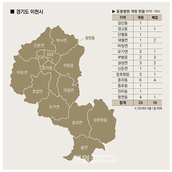 이천시 동물병원은 현재까지 44개의 동물병원이 개원해 그 중 64%(28개소)의 동물병원이 남아 있다.