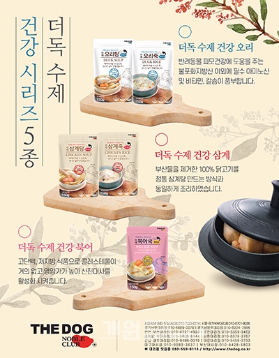 한국사료 측은 수제 시리즈로 ‘더독 수제 북어국’도 준비 중이다. ‘더독 수제 북어국’은 잘 알려진 것처럼 반려동물의 원기회복에 도움을 주며, 어린 반려동물의 성장 호르몬 분비를 높여 근육 발달에 중요한 세포를 성장시키는 역할을 한다.