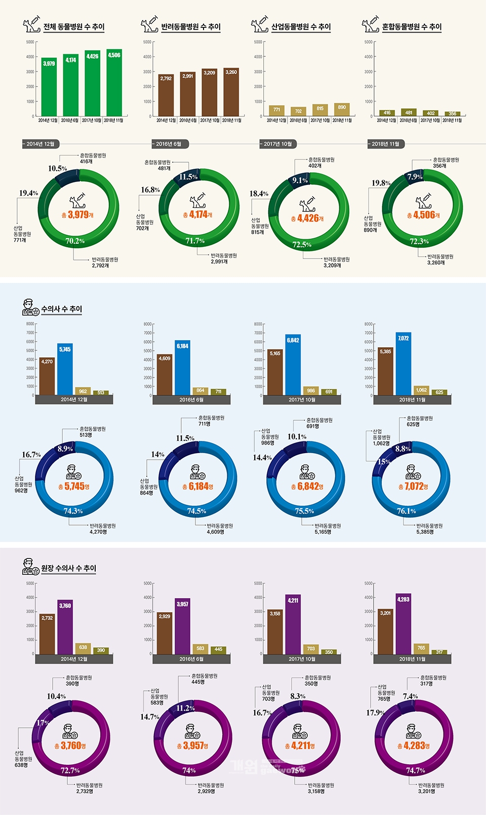 임상수의사 수는 2014년 12월 5,745명에서 2018년 11월 7,072명으로 1,327명 증가하며 23%나 늘어났다. 이 중 반려동물 임상수의사는 4,270명에서 5,385명으로 1,115명(26%)이 증가해 전체 임상수의사 증가 폭의 84%를 반려동물 임상수의사가 차지했다.