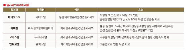현재 중간엽줄기세포를 주 성분으로 허가받은 줄기세포치료제는 카티스템과 뉴로나타알 등이 있다. 무릎연골 결손과 크론병으로 인한 누공치료 등에 사용하고 있지만 약가가 높게 형성된데다 대부분 희귀질환 치료제로 출시되면서 환자 접근성이 떨어진다.