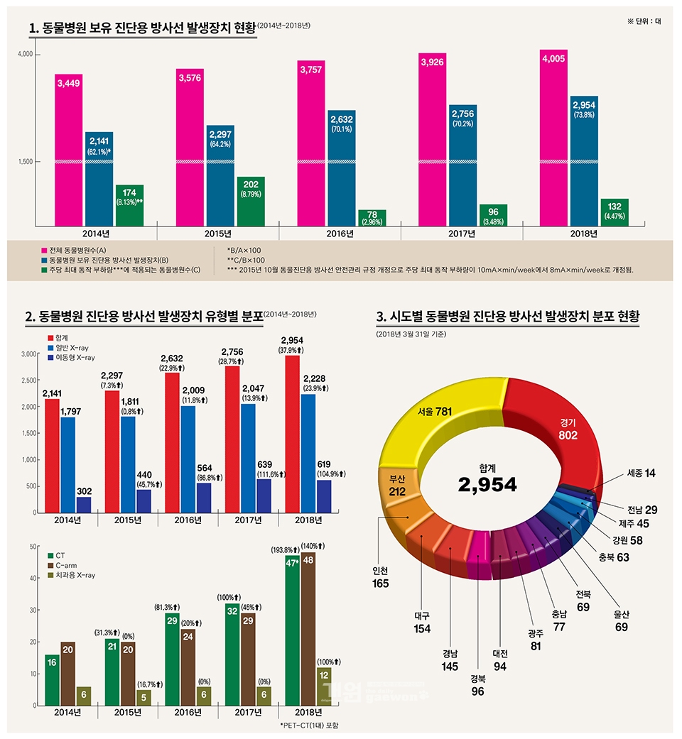 농림축산검역본부가 <동물병원 방사선 발생장치 관리현황 및 방사선 관계 종사자의 개인 피폭선량 연보>를 처음으로 발간, 2018년 3월 31일 기준 전국 동물병원에서 신고된 동물진단용 방사선 발생장치는 총 2,954대로 2014년에 비해 813대(37.9%) 증가한 것으로 나타났다.
