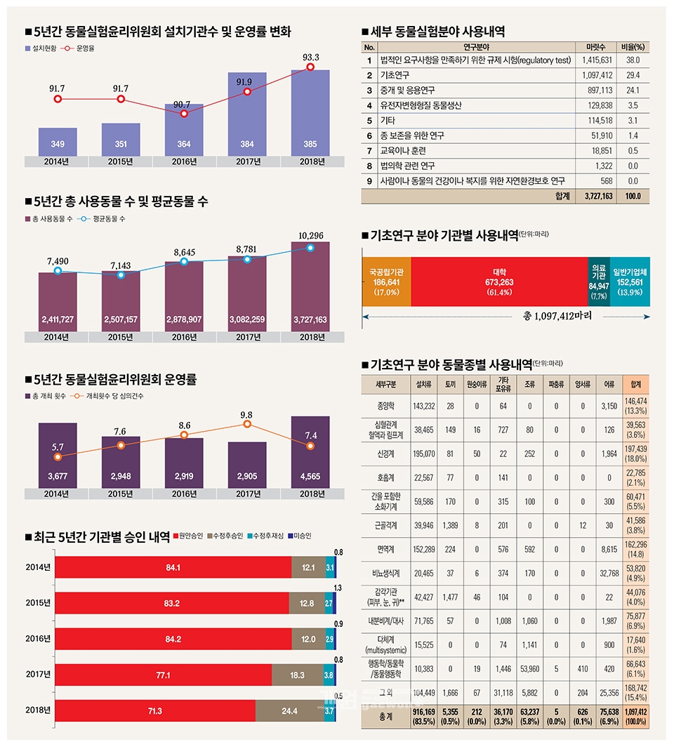 농림축산검역본부가 발표한 ‘2018년 동물실험 및 실험동물 사용 실태 보고’에 따르면, 동물실험윤리위원회 설치기관은 385개소로 그 중 359(93.2%)개소에서 33,825건의 동물실험계획을 심의하고, 동물실험에 사용된 실험동물 수는 총 3,727천마리로 조사됐다. 그 중 설치류(3,133천마리,84.1%)를 가장 많이 사용했으며, 동물실험 세부 분야 중 기초연구에 사용된 비율은 29%로 이를 수행한 기관 중 대학이 61.4%로 가장 많았다. <편집자주>