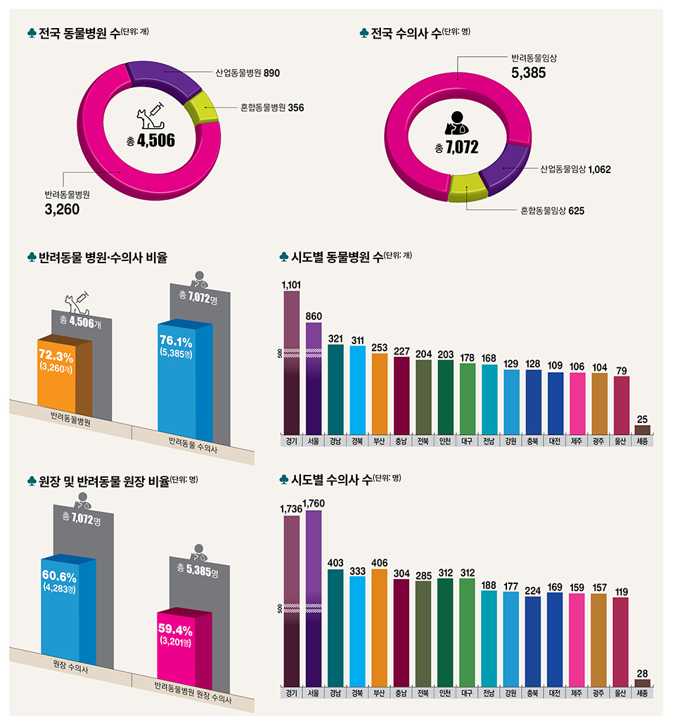 동물병원을 개설한 원장 수의사 수는 총 4,283명으로 전체 수의사 중 60.6%, 반려동물병원 원장 수의사는 3,201명으로 전체 반려동물 수의사 중 59.4%로 나타났다. 지역별 동물병원 수는 경기도가 1,101개로 가장 많았으며, 수의사 수는 서울이 1,760명으로 가장 많았다. 원장 수의사는 경기도가 1,070명으로 가장 많았다. <편집자주>