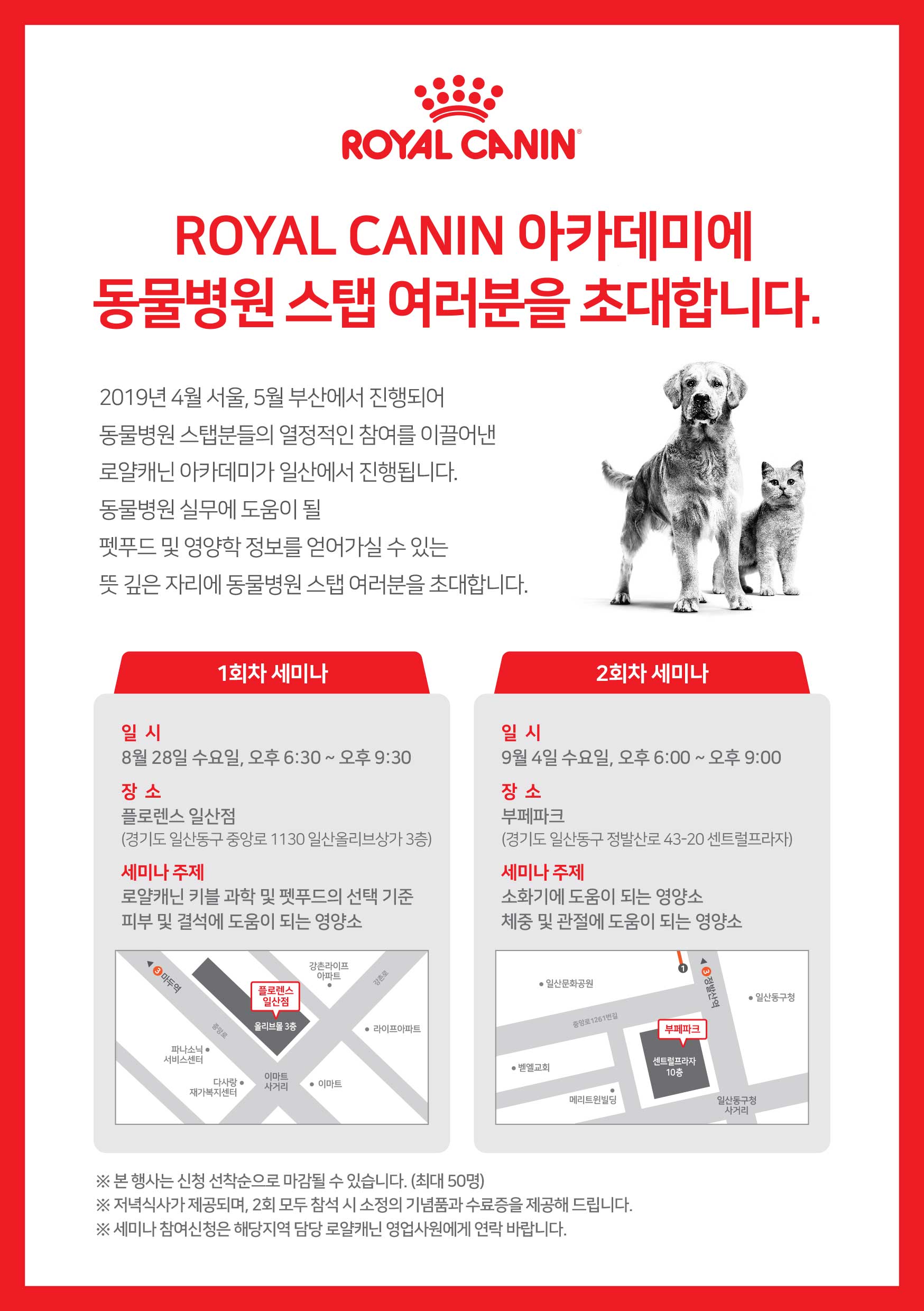 1회차 세미나는 8월 28일 △로얄캐닌 키블 과학 및 펫푸드의 선택 기준 △피부 및 결석에 도움이 되는 영양소에 대해 오후 6시 30분부터 9시 30분까지 일산동구 올리브상가에 위치한 플로렌스 일산점에서 진행한다.
