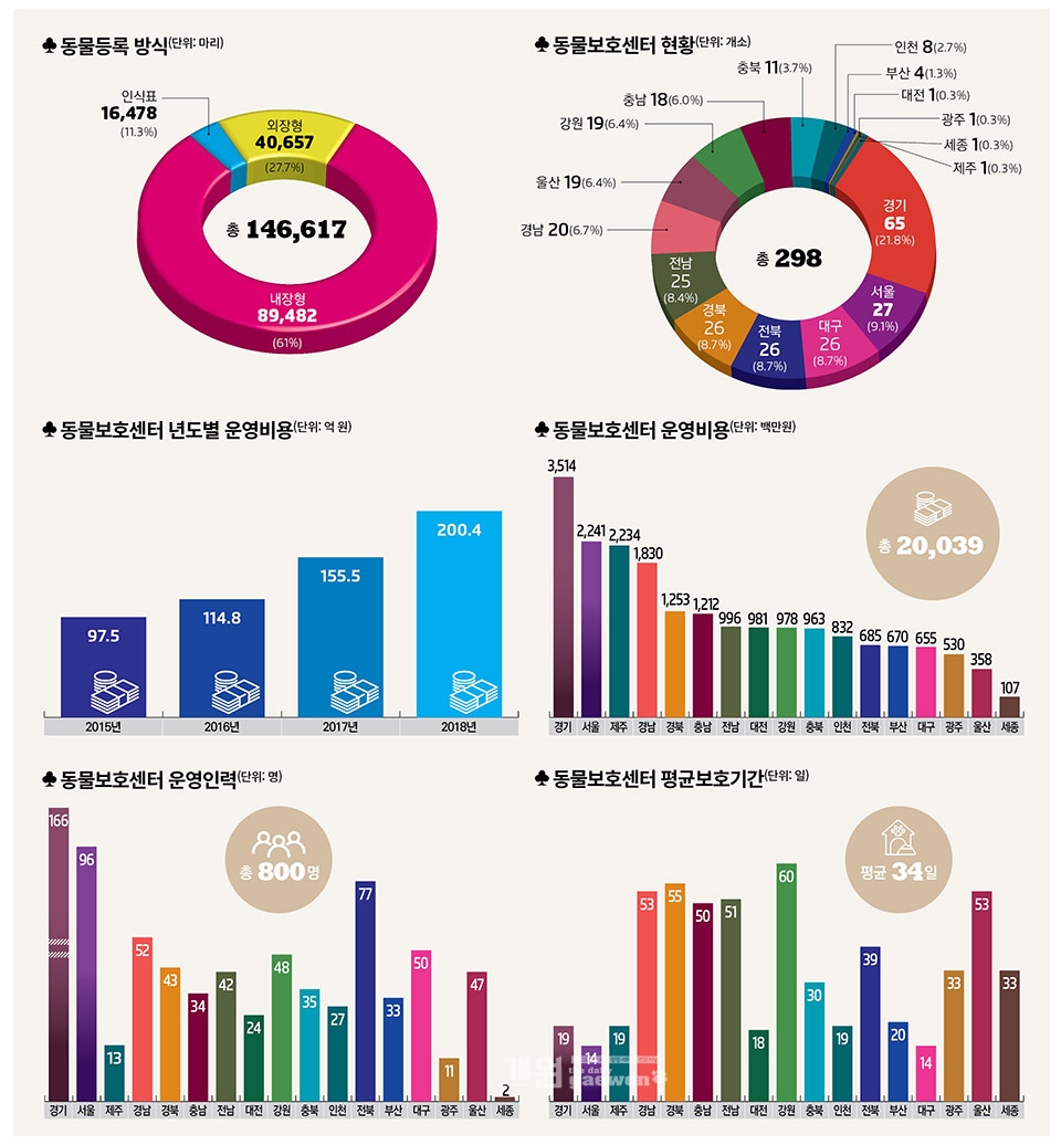 2018년 전국의 동물보호센터는 298개소로 운영인력은 총 800명, 평균보호기간 34일, 운영비용 총 200억 4천만 원이 소요된 것으로 조사됐다. 유실·유기 동물 구조·보호 비용을 포함한 전체 운영비용은 전년대비 28.9% 증가한 것으로 나타났다. <편집자주>