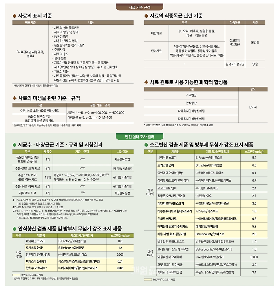 한국소비자원이 시중에 유통 판매 중인 반려동물용 수제 사료 및 간식 25개 제품에 대한 안전조사를 실시한 결과, 위해미생물·화학적 합성품(보존제 등)에 대한 기준과 규격이 미비해 제도 개선이 시급한 것으로 나타났다.