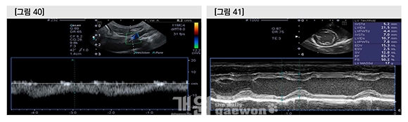 Portal vein의 flow velocity는 8.2cm /sec 로서 문맥을 통한 간의 blood supply는 양호하였다. 심장초음파상에 이완기말 좌심실 직경(LVDd)이 21.5mm로서 참고범위(13.97~16.24mm) 이상 이었으며, LA/Ao 1.89로서 volume overload에 대한 remodeling은 변화가 없었다.