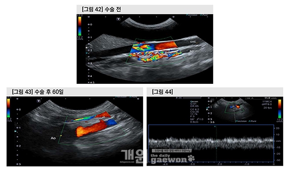 Portal blood flow velocity는 11.9 cm/sec로서 참고범위를 회복 하였으며, 최초 내원 시에 Aortal의 ventral aspect에서 관찰되었던 vessel plexus는 CF doppler 상에 관찰되지 않았다.