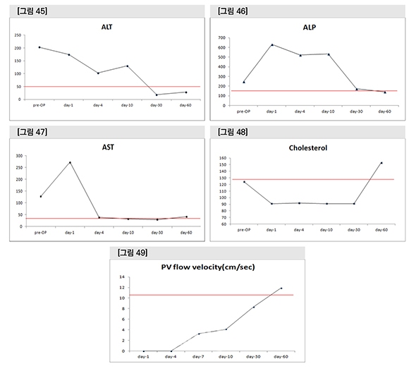 Portal blood flow velocity의 뚜렷한 개선을 보였던 수술 후 30일째에는 높았던 간 관련 혈액수치가 참고 범위 내에서 측정되었다. 수술 후 30일째 bile acid test를 진행하였는데, pre 1 umol/L, post >150umol/L로 Pre-prandial은 개선 되었으나 post는 여전히 높은 상태였으므로 간 기능은 아직 회복되지 않았다.