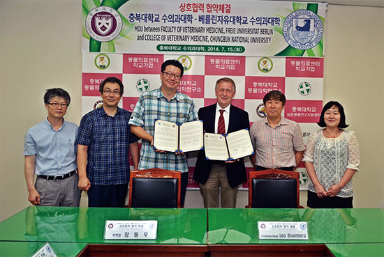 충북대학교 수의과대학(학장 정의배)과 베를린 자유대학교 수의과대학(학장 Leo Brunnberg)이 7월 15일(화) 충북대수의과대학 교수회의실에서 교수 및 관계자가 참석한 가운데 상호협력 협약을 체결했다.