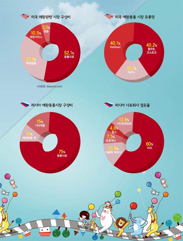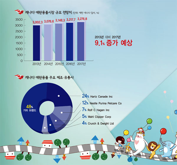 애완용품시장 등 관련 산업이 세계 각국에서도 성장 가능성이 아주 높은 시장으로 각광받고 있다. 대한무역투자진흥공사(KOTRA)가 발표한 자료에 따르면, 캐나다 애완용품시장은 프리미엄 바람이 불어 지속적인 경기 불황에도 관련 시장은 성장세를 나타내고 있고, 미국은 반려동물용 집, 박스 등 수요가 증가하면서 미국 역시 애완동물 연관 산업의 성장 가능성을 매우 높게 평가하고 있다. 다음은 캐나다, 미국, 러시아의 애완용품시장 경향이다. <편집자주>