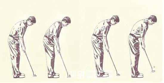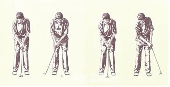 양쪽 무릎의 자세가 퍼팅하는 동안 전혀 달라지지 않는 점에도 주의하도록 합니다. 대부분의 나쁜 퍼팅은 백스윙이 너무 길고 다운스윙할 때 감속을 할때 나타납니다. 오히려 백스윙의 길이를 짧게 자제하면서 다운스윙 때 가속을 붙여 정확하게 타구하도록 노력해야 합니다.