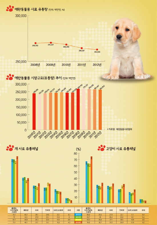 일본의 반려동물시장 전체 규모는 2012년 소매액 기준 1조4,133억 엔으로 전년대비 100.7% 증가했다. 2013년 역시 전년대비 101.4% 증가한 1조4,233억 엔 규모에 달해 지속적인 증가 추세에 있다. 일본의 개 사육 수는 2013년 10월 기준 1,087만2,000두, 고양이 사육 수는 974만3,000두로 추계하는데, 개는 해마다 감소하고, 고양이는 미미하게 증가하고 있다. 반려동물 사료시장 규모 또한 2012년 소매액 기준 4,428억 엔으로 전년대비 101% 성장했다. 사료 유통채널을 살펴보면, 개 사료는 펫용품 전문점을 중심으로 유통됐으나 최근에는 홈센터, 할인점, 펫숍, 슈퍼, 인터넷 통판, 드러그 스토어, 수의사 등을 통해 판매되고 있다. 도매상으로 유통됐던 것이 도매상을 배제하고 소매점에 직접 납품하는 형태가 늘어나는 추세다.