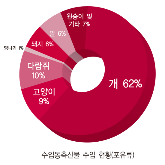 품목으로 살펴보면 포유류 중 개가 2,840마리로 작년 2,393마리에 비해 447마리 늘어났으며, 고양이가 419마리로 작년 372마리에 비해 47마리 증가했다. 또한 다람쥐 441마리, 당나귀 56마리, 돼지 268마리, 말 254마리, 원숭이 222마리가 수입됐다.