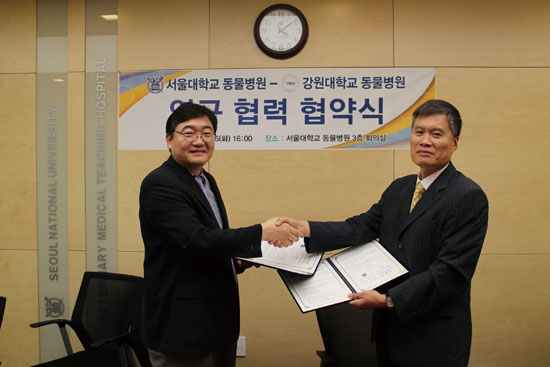 지난 8월 5일(화) 강원대학교 수의과대학 동물병원(병원장 권혁무)과 서울대학교 수의과대학 동물병원(병원장 서강문)이 연구 및 진료협력에 관한 양해각서를 체결했다.