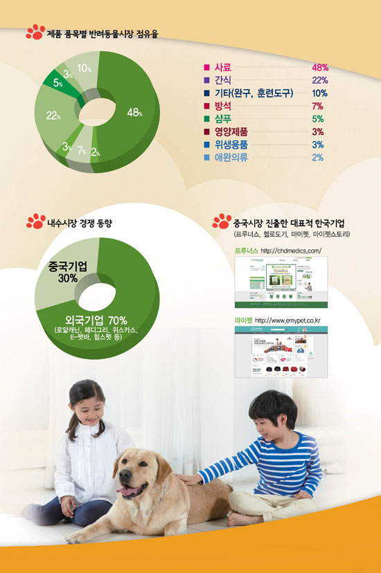 중국의 반려동물 식품시장은 지난 1995년 로얄캐닌의 진출을 계기로 페디그리, 위스카스, E-펫바, 힐스펫 등 외국기업이 70%를 차지하고 있다. 중국시장에 진출한 대표적인 한국기업으로는 프루너스, 헬로도기, 마이펫, 마이펫스토리 등이 있다. <편집자주>