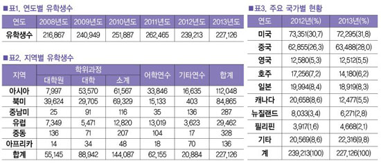 지금까지 해외유학은 증가 추세였다가 2011년을 최고점으로 찍고 이제는 조금씩 하향추세에 돌입하기는 하였으나(표1. 연도별 유학생 수 참조), 여전히 해외유학 부동의 1위는 ‘미국’에서 한번도 벗어난 적이 없다.