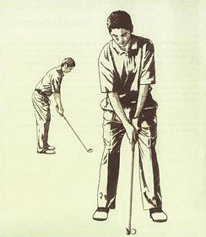 두 발을 어깨 넓이로 벌려주고 엉덩이를 뒤로 빼면서, 클럽 헤드가 잔디에 닿을 때까지 상체를 숙입니다.