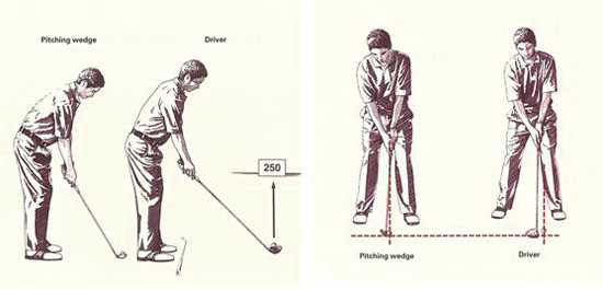 그림에서 보는 바와 같이 드라이버를 칠 때와 피칭 웨지를 칠 때의 볼과 몸 사이의 거리는 달라지므로, 각각의 클럽마다 상체를 알맞게 기울이도록 각도를 조절합니다.