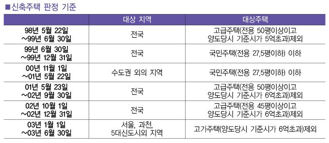 ③ 2003년 1월 1일~2003년 6월 30일: 서울, 과천, 5대 신도시 지역 밖에 소재한 주택으로서 고가주택을 제외한 모든 신축 주택.