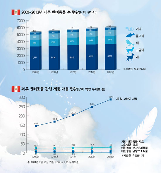 페루의 전체 반려동물 수는 연평균 3%씩 증가하고 있다. Euromonitor International의 2013년 ‘반려동물 관리용품 보고서’에 따르면, 페루 반려동물 수는 2013년에 약 614만 마리로 개(60.1%), 고양이(19.2%) 순이며, 개와 고양이 수는 2009~2013년에 각각 10.5%, 23% 증가, 고양이 수가 개와 비교해 두 배 이상의 속도로 증가하고 있다. 또한 반려동물시장 전체 매출의 92%를 개와 고양이 사료가 차지하고 있다.