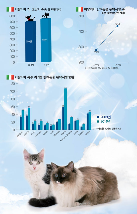 Euromonitor 통계에 따르면 이탈리아의 반려견 수는 약 700만 마리, 고양이는 약 750만 마리로 추정된다. 휴가 혹은 출근 시 반려동물을 맡길 수 있는 맞춤형 위탁시설이 급증하고 있는데, 밀라노 상공회의소 조사에 따르면 2009~2014년 5년 사이에 이탈리아 북부 롬바르디아 지역의 반려동물 위탁시설은 278개에서 434개로 약 56% 증가했으며, 이탈리아 전국적으로 현재 약 2,000개로 집계되고 있다. 반면에 유기되는 반려동물도 연간 6만 마리에 달해 심각한 사회문제로 대두되고 있다. <편집자주>