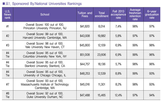 순위기준은 1,800개의 대학을 신입생 입학성적, 경쟁률, 졸업율, 학교의 평판, 재정 등을 종합적으로 평가해서 뽑았다고 한다.