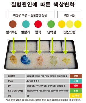 이때 담관폐색증, 간괴사, 간염, 담관간염 등의 질환이 있으면 모래의 색이 갈색으로 변하고, 세균감염, 결석 등은 청색, 하부요로계질환, 생식기질환, 전신질환 등은 적색으로 변한다. 또한 용혈성질환, 신증후군, 고혈압, 신부전증 등은 녹색으로 변하며, 정상인 경우는 노란색의 색상을 띠게 된다.