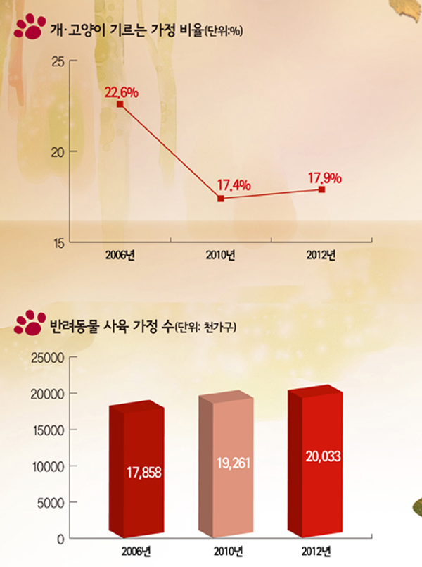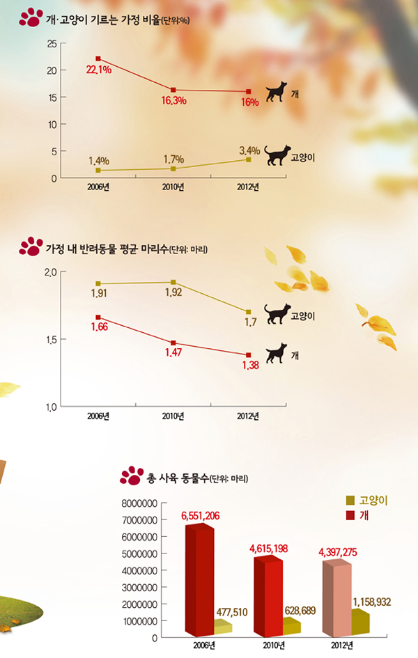농림수산검역검사본부가 ‘2012년 동물보호에 대한 국민의식 조사 결과’에 따르면, 개나 고양이를 기르는 가정은 약 359만 세대인 17.9%로 추산되는데, 이는 6년 전인 2006년 22.6%에 비해 감소한 수치다. 2012년 개와 고양이를 기르는 가구 수는 20,033천 가구로 조사됐다. 사육 비율은 개가 22.1%(2006년), 16.3%(2010년), 16%(2012년)로 감소 추세를 보인 반면, 고양이는 1.4%(2006년), 1.7%(2010년), 3.4%(2012년)로 증가 추세를 나타냈다.