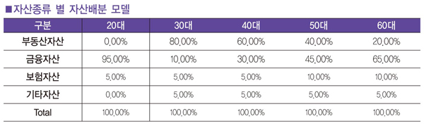 40대에는 부동산의 비중을 60%정도 유지할 수 있도록 자산의 비중을 조정하면서 낮았던 현금흐름의 비중을 30%까지 보유하는 전략이 필요할 것이다. 50대에는 부동산자산의 비중을 점차 줄이며, 현금의 비중과 절세전략에 필요한 보험자산의 비중을 높이는 전략이 필요할 것이다. 이처럼 나이대별 자산관리 모델을 준수하면서 합리적인 절세전략을 병행해 나아간다면 만족스런 결과를 얻을 수 있을 것이다.