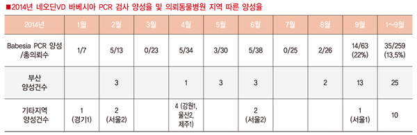 네오딘VD 측은 “2012년부터 2014년까지의 네오딘 바베시아 PCR 통계를 살펴보면, 평균 양성율은 10% 전후이며, 9~10월에 양성율이 20% 전후로 높아지는 양상이 매년 반복되고 있다”며 “가을철에 바베시아 검사 의뢰 건수가 증가하며 그 양성율도 증가한다”고 전했다.