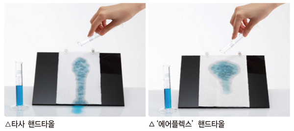 기존의 일반 핸드타월은 압착 건조 방식으로 섬유조직 사이에 공간이 적어 상대적으로 흡수력과 부피감이 떨어지는 반면, 유한킴벌리만의 신기술로 탄생한 ‘에어플렉스’ 타올은 입체 건조방식으로 성기게 엉킨 섬유조직 사이에 생긴 수많은 공간이 흡수주머니 역할을 해 물기를 빠르게 흡수하는 것이 특징이다.