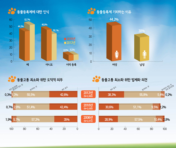 농림수산검역검사본부가 ‘2012년 동물보호에 대한 국민의식 조사 결과’에 따르면, 개를 키우고 있는 응답자의 과반수(52.7%) 이상이 동물등록제에 등록할 의향이 있으며, 이 중 동물등록제에 등록한 응답자는 2010년에 비해 다소 줄어든(8.2%) 것으로 나타났다(▼0.7%p). 동물등록제를 기피하는 이유로 여자들은 개를 기르는 것이 ‘시민의 자유’(44.2%)라는 의견을 가장 많이 내세웠으며, 남자들은 ‘등록이 귀찮아서’(30%)가 가장 많았다.