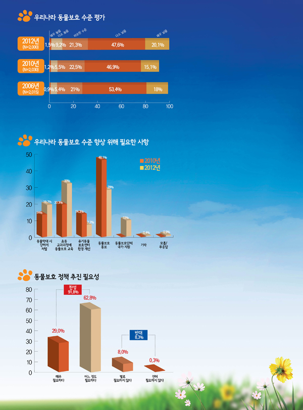우리나라 ‘동물보호 수준’에 대해서는 응답자의 67.7%가 낮은 수준으로 평가했으며, 2010년 62%에 비해 오히려 5.7% 늘어나 낮게 평가하는 비율이 더 높아진 것으로 나타났다. 동물보호 수준 향상을 위해 필요한 사항으로는 2010년 ‘동물보호에 대한 홍보’가 48.1%로 가장 많았지만, 2012년에는 29%로 두 번째를 차지했으며, 2012년 가장 필요하다고 꼽은 사항은 ‘초등학교 교과과정에 동물보호 교육 실시’(33%)로, 2010년 20.3%로 두 번째로 꼽혔던 사항이 1위를 차지했다.