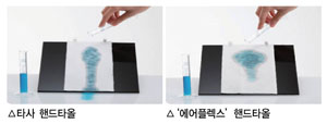 실제로 유한킴벌리 핸드타올은 타사 제품과 비교해 흡수속도는 최대 약 21.3배 빠르고, 습윤인장강도는 최대 약 2.7배 강한 것으로 확인됐다. 타사 핸드타올과 1장의 면적만 비교해 보아도 유한킴벌리 핸드타올이 최대 42% 정도 넓다.