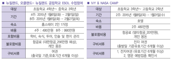 문화체험보다는 단기간에 영어실력을 올리고자 영어집중 코스를 선호하는 경우는 저렴한 학비와 숙식비 그리고 1:1 수업이 가능한 필리핀, 겨울방학에는 날씨가 따뜻한 지구 반대편의 호주나 뉴질랜드, 미국대학 진학을 꿈꾸고 있다면 미동부 등 날씨, 연수목적, 경비 등을 고려하여 신중한 선택을 하기 바란다.