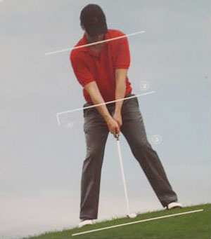 오르막과 내리막 경사면에서 스윙할 때 척추의 각도를 무너뜨리지 않고 어드레스에서 이루어진 각도대로 척추를 비틀어 백스윙을 하고 싶다면, 평소 풀스윙 때의 백스윙보다 크기를 줄여야 합니다.