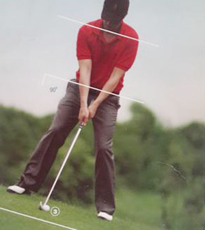 이렇게 하면 다운스윙 때 척추의 각도가 잘 유지되므로 경사면에 놓인 공만 깨끗이 쳐서 좋은 결과를 기대할 수 있게 됩니다.