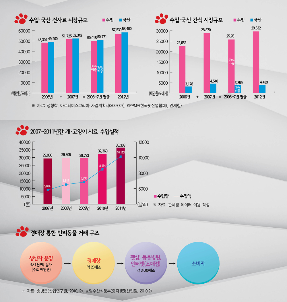 2012년 반려동물 사료시장 규모는 수입 건사료가 도매가 575억3천만 원, 국산 건사료가 584억 원으로 나타났으며, 수입 간식은 296억3천2백만 원, 국산 간식 44억3천9백만 원으로 조사됐다. 즉, 2012년 전체 사료시장 규모는 1천5백억 원 수준이다.