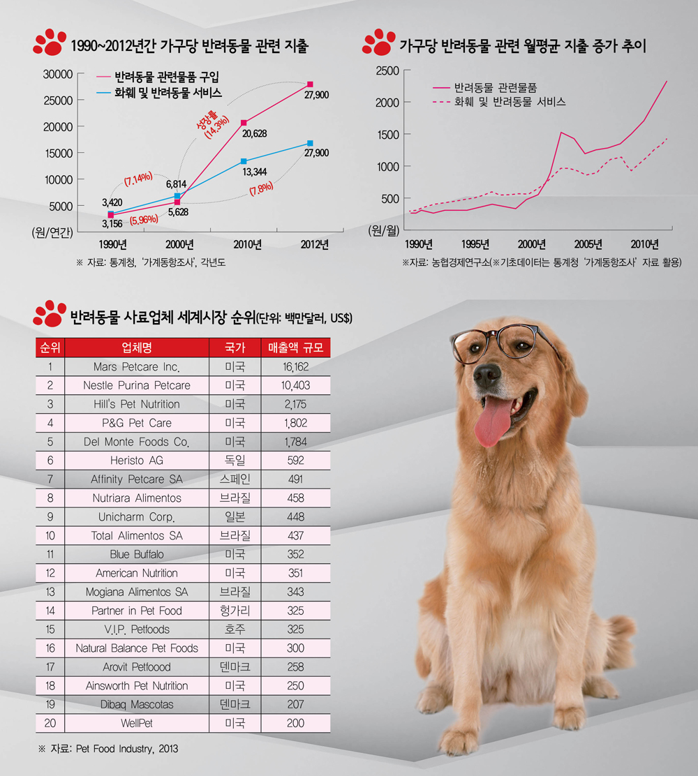 특히 가구당 반려동물 관련 지출액이 2000년 이후 급상승한 것은 애완동물의 반려동물화에 따른 관련용품 구입이 늘었기 때문으로 분석되는데, 반려동물 관련물품 구입은 90년도에 연 3,156원에서 2000년 5,628원으로 연평균 5.96% 성장에 그쳤지만, 2012년에 27,900원으로 2000년보다 연평균 14.3%나 성장했다.