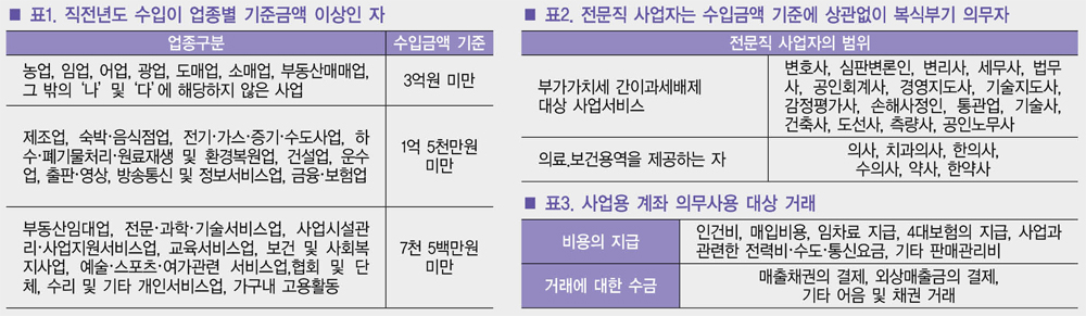 사업용 계좌의 신고는 ‘복식부기 의무자’에 한한다. 복식부기 의무자는 누구일까? 복식부기 의무자는 <표1, 2>와 같다