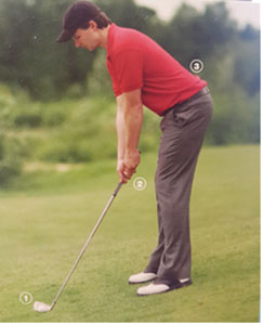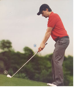 사진에서 보는 바와 같이 평지에서보다 상체의 각을 세워서 스윙을 하기 때문에 백스윙 궤도 또한 낮고 완만하게 올라가야 합니다.