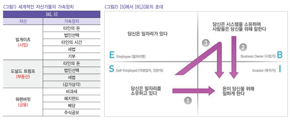 <그림 2>에 표현한 [S]에서 [B],[I]로의 초대는 원장님들과 같은 전문직 종사자들에게 나만의 자산관리시스템을 통해 돈을 위해 일하는 원장님이 아니라 돈이 원장님을 위해 일 할 수 있도록 준비할 것을 제안하고 있습니다. 특히 고급투자정보를 통한 투자자로서의 활동을 제안하고 있습니다.