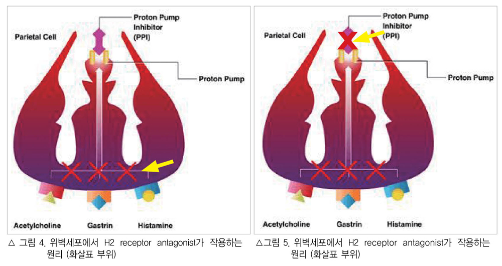 이 계열의 약물은 H2 receptor antagonists보다 더 상위 단계인 proton pump를 차단함으로써 강력한 위산 분비의 저하(cimetidine보다 20배 정도 강력함)를 가져올 수 있다<그림 5>.