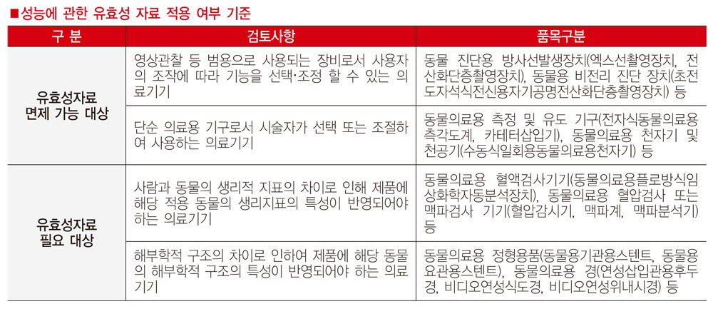 이에 따라 영상장치 및 단순의료기구의 경우 전환 시에는 안전성이나 사용에 큰 문제가 없어 유효성 자료 제출이 면제된다. 그 외 사람과 동물의 생리적 지표와 해부학적 구조 차이로 인해 나타날 수 있는 문제를 없애기 위해 혈액검사기, 혈압검사기, 맥파검사 기기, 스텐트 등의 정형용품, 연성삽입관용후두경 등의 동물의료용 경은 유효성 자료를 필요로 한다.